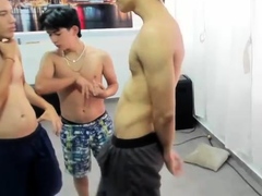 Cute brunette gay Asian twinks having sex under the shower