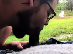 Bearded bear sucks black cock outdoor